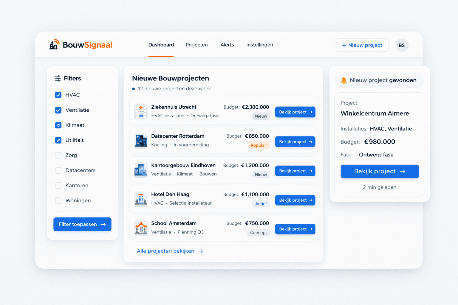 BouwSignaal stuurt installatiebedrijven elke week nieuwe utiliteitsbouwprojecten waar HVAC-installaties nodig kunnen zijn